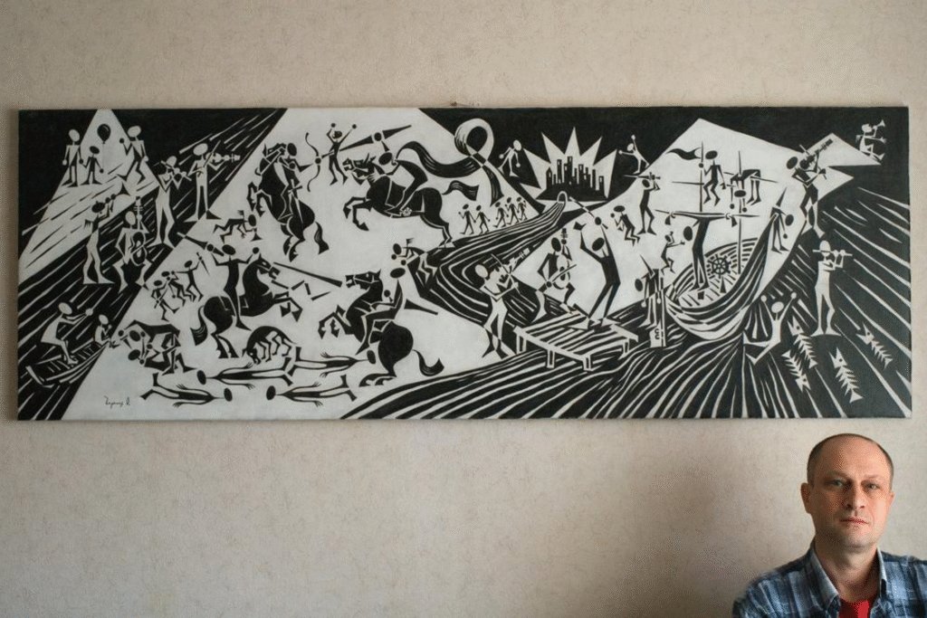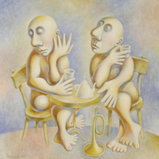 dit is het meest vrolijke schilderij van Oleg, ik heb het gevoel dat deze kunstenaar een donker kijk heeft op het leven, hij schilderde dit tijdens een ontmoeting met zijn collega Alexander Danliov