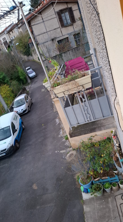 Als ik rechts uit mijn raam kijk van de (woonkamer/keuken slaap ) kamer zie ik het balkon van de slaapkamer van Mélinda die woont daar met haar moeder, af en toe hebben we contact