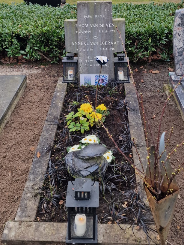 Het graf van onze vader en moeder, ook Nicole heeft er een plekje, op zich heb ik niks met een graf, maar het idee dat we er als broers en zussen allemaal neerstrijken in de vorm van een door Monique gemaakte sculptuur waarin wat as zit van degene die is overleden , de laatst levende van de negen heeft dan een plekje waar we bij mekaar zijn verenigd in de eeuwigheid, de vraag is of de nazaten het plekje willen behouden of dat we in de vergetelheid mogen wegzakken,