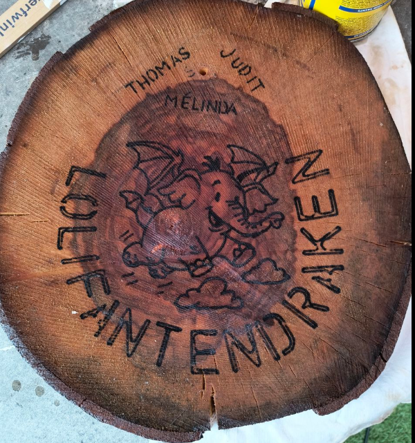 Judit had als verrassing het lolifantendraken logo geëtst in een schijf hout van de Berkenboom uit onze voortuin